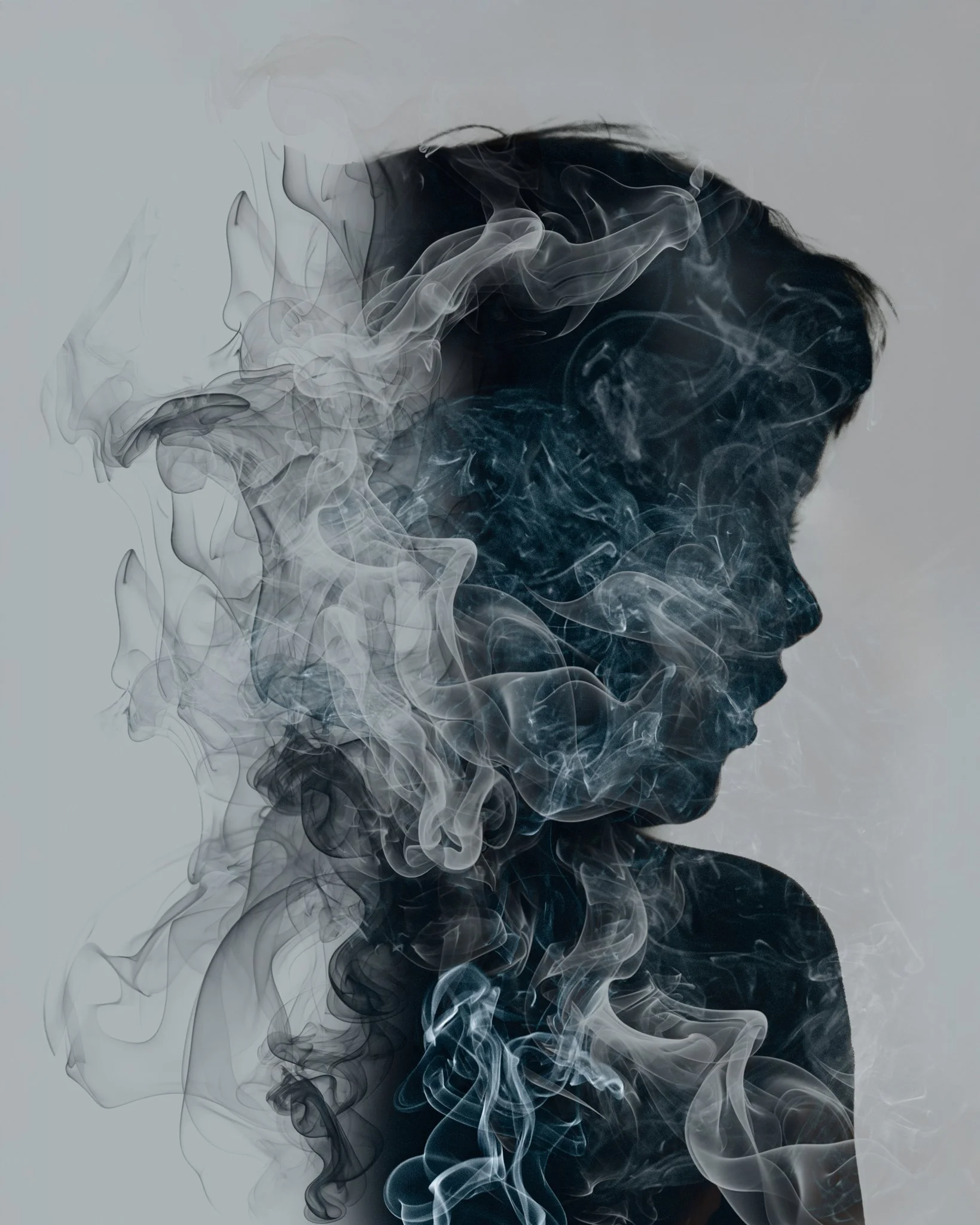 The final image, above, was created by masking my son’s profile in Photoshop, adding a grey fill layer beneath it, and layering images of smoke on top. I used different blending modes and masks to reveal the smoke. I also created a set of brushes from the smoke images to soften the back of his head—so it looks like he’s appearing in a cloud.