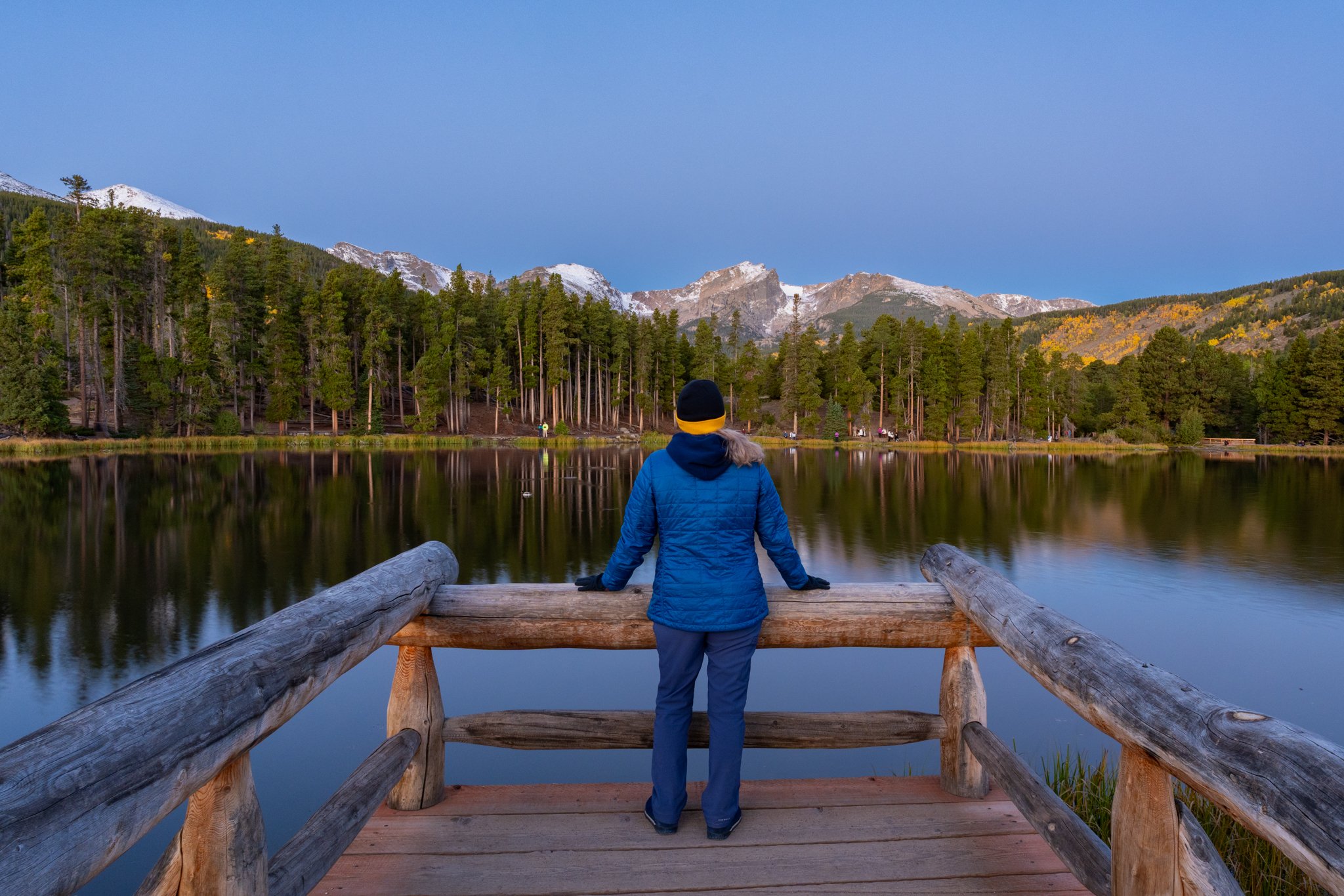 The image above was taken in the Fall in Colorado while waiting for a sunrise over the mountains. We plotted out this location the night before after finding this great little dock. Originally, my idea for this composition was to have the alpenglow hitting the mountains. Unfortunately, I had a group of maybe 10 to 15 people all wanting to get their photo at this location at sunrise. I really don’t like people staring at me and it felt rude to monopolize the entire dock during sunrise. So I took my shot and then allowed other people to get an image too. I do have the alpenglow images I wanted, just not with me in them. After the fact, I noticed my head going through the horizon, but you know what? I’m new at this whole photographing people thing, so I try not to care too much. The bottom line is I have a cool photo of me in front of a mountain view. It’s a win!