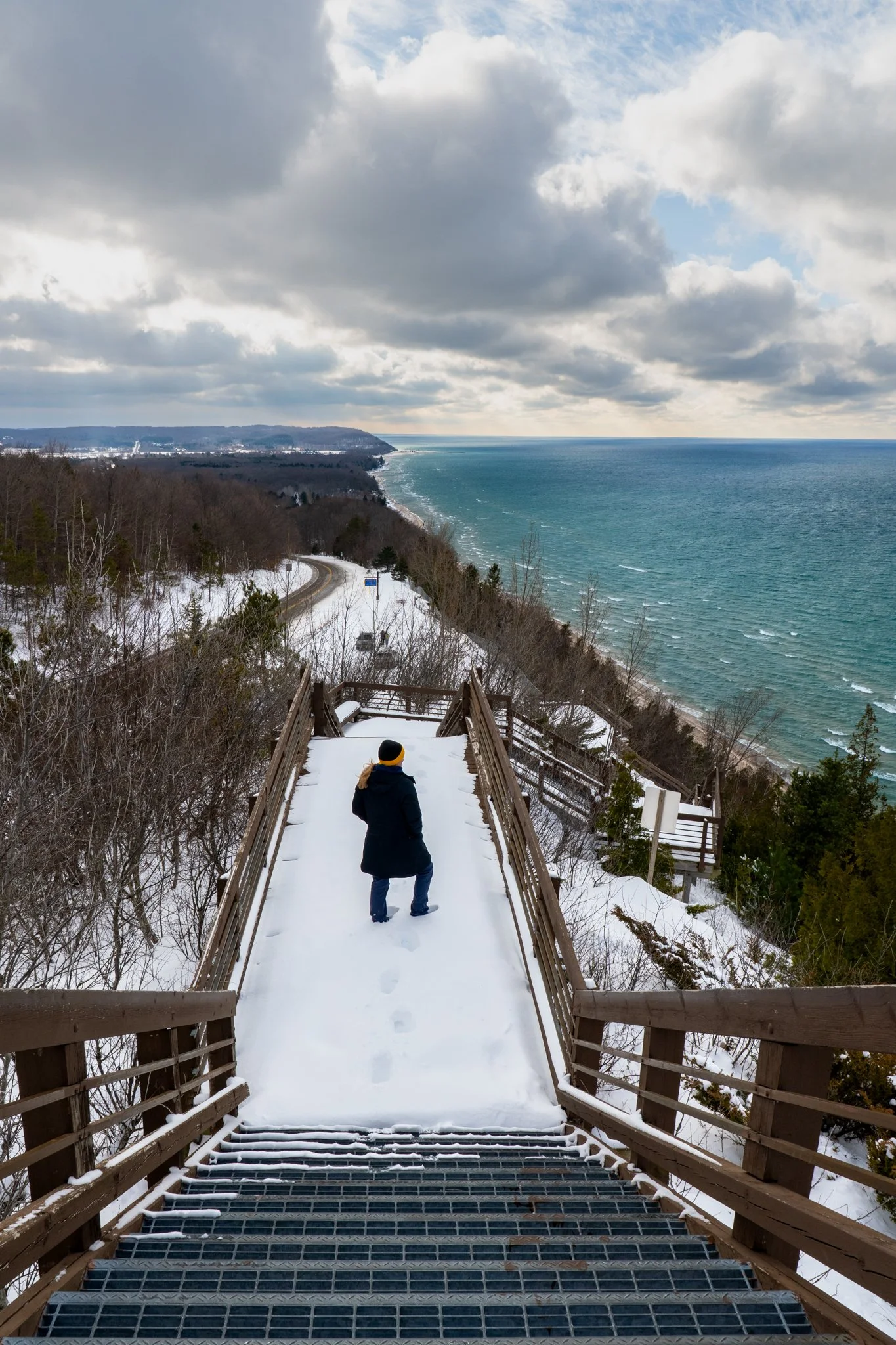 In December, I headed north to meet up with photographer friends for a weekend of adventure. I was driving by my favorite viewpoint and passed right by it because I got stuck in the snow there the other year. That day, though, it looked like the snow had been plowed! I knew instantly I had to go take a look because it’s just the most beautiful view. When I got out of my car I looked up the stairway and saw a foot of snow on each landing and second-guessed my plan. I decided to go for it though and climbed more than 120 stairs through the snow to get up to the spot that I like to shoot from at this location. It was painfully cold and windy so the only layer I took off was my hood. My tripod was shoved down in the foot of snow on the landing above me and you can see the bottom of my legs have disappeared in the snow too.