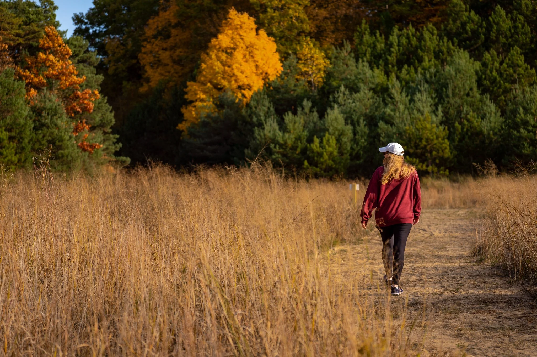 A friend visited early in November and I knew the fall colors would be great at this local park. A section of the park had just opened up with new trails so we decided to explore the area. The second I saw this beautiful orange tree and the sea of brown dune grasses along the pathway I knew I needed this scene for my project. My friend graciously snapped the image since I didn’t have a tripod. It took us some experimenting with angles and directions because the wind kept blowing my hair everywhere.