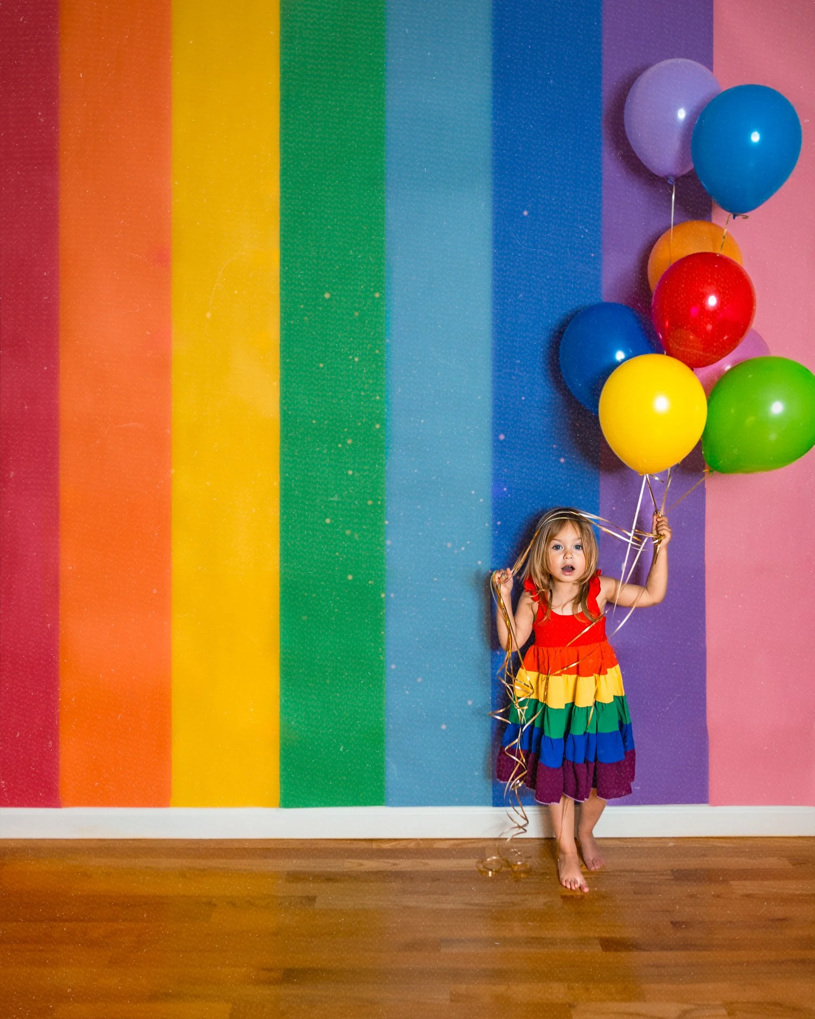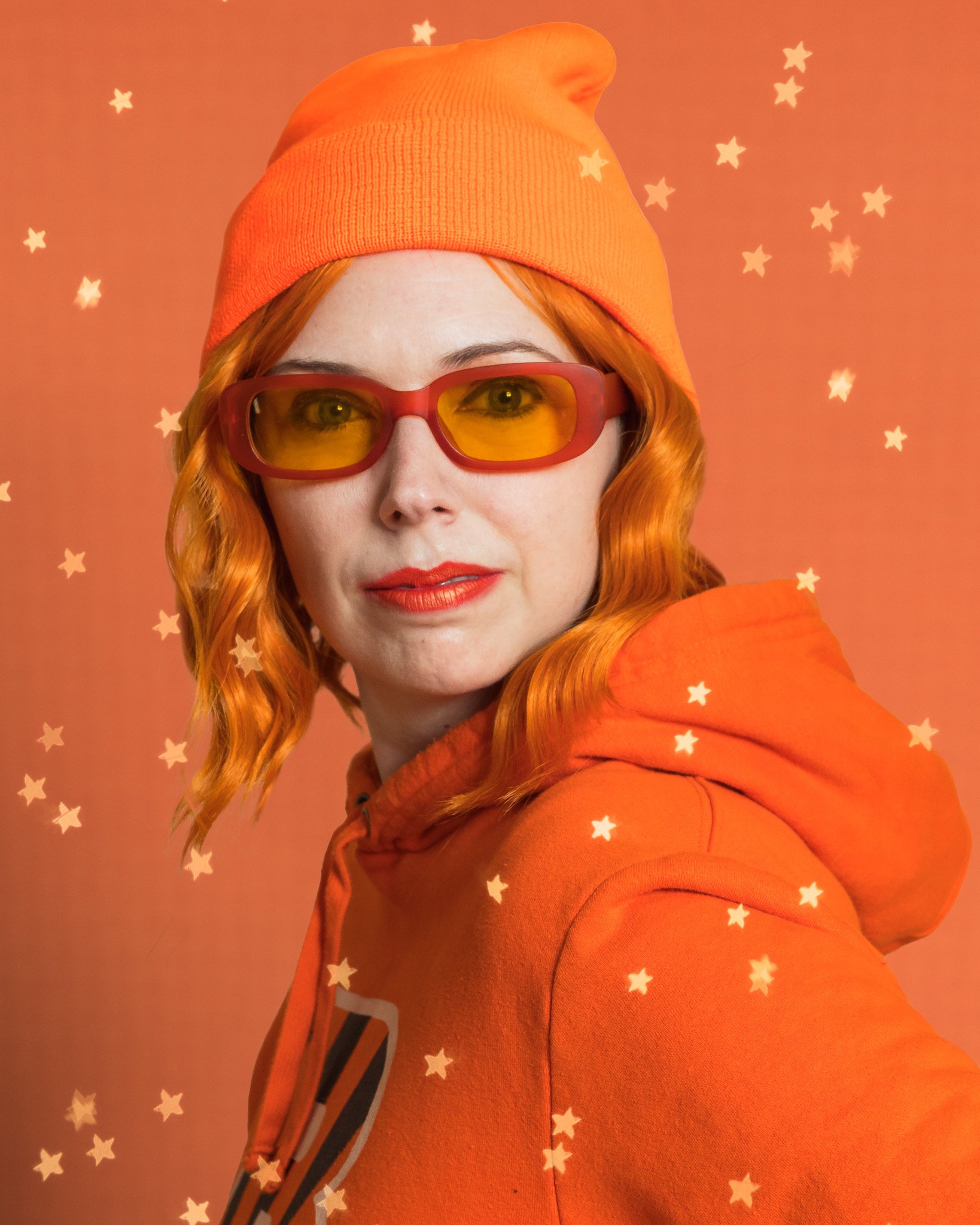 My theme the first year was just fully embracing the colors themselves. It was a crazy idea I had that I thought would be fun. I bought the cheapest, best-looking wigs I could find in every color of the rainbow. I gathered a whole color spectrum of hats and sunglasses over the course of the year. I sourced clothes from wherever I could, including my husband’s closet. I also hit up the craft store for different glitter and confetti to make matching overlays. I shot most of the photos against a beige wall and then changed the background color in post. There were a lot of things to figure out as I went, and it was not without its challenges, but in the end I had so much fun that I wanted to do it again.